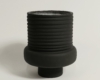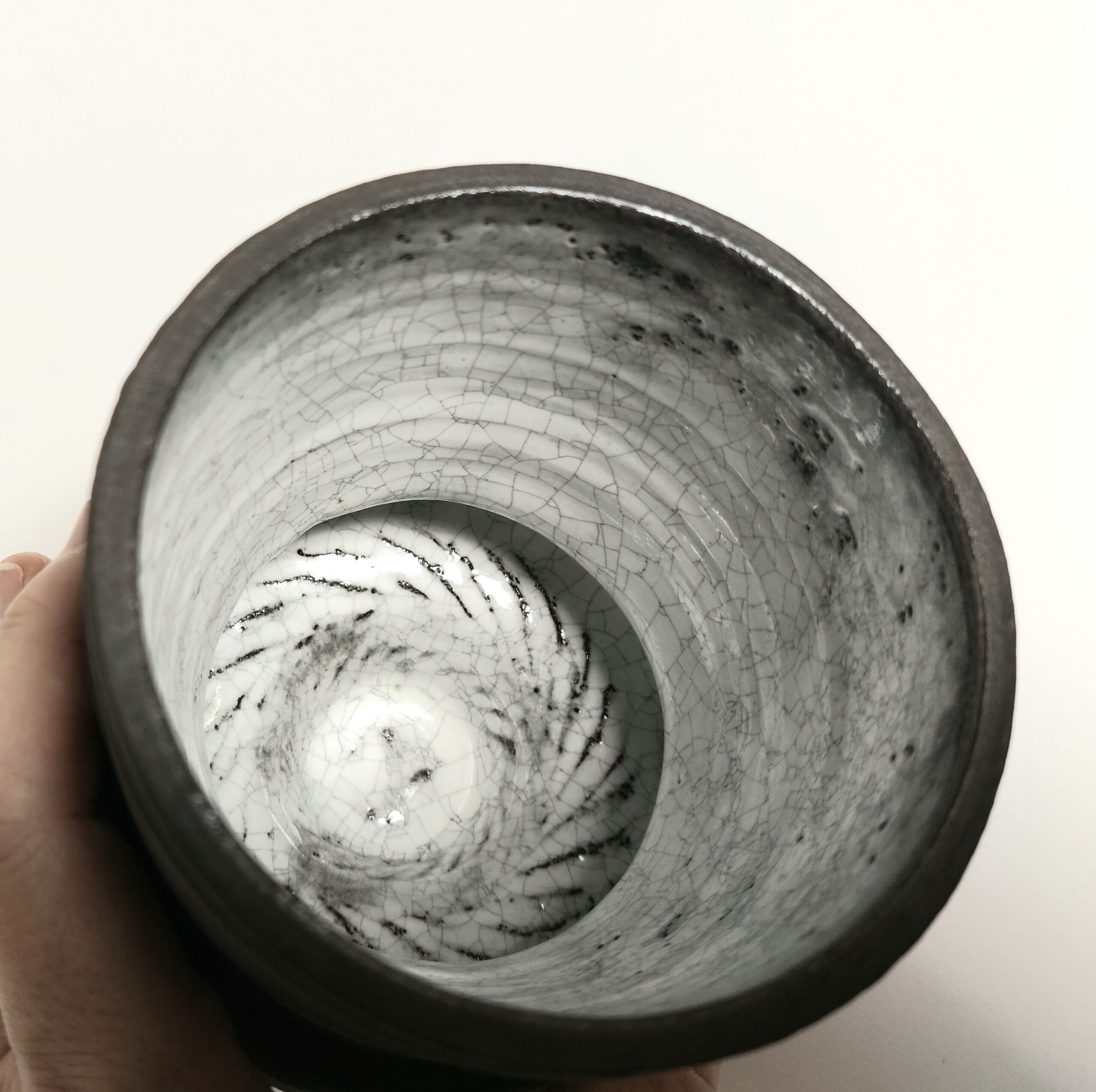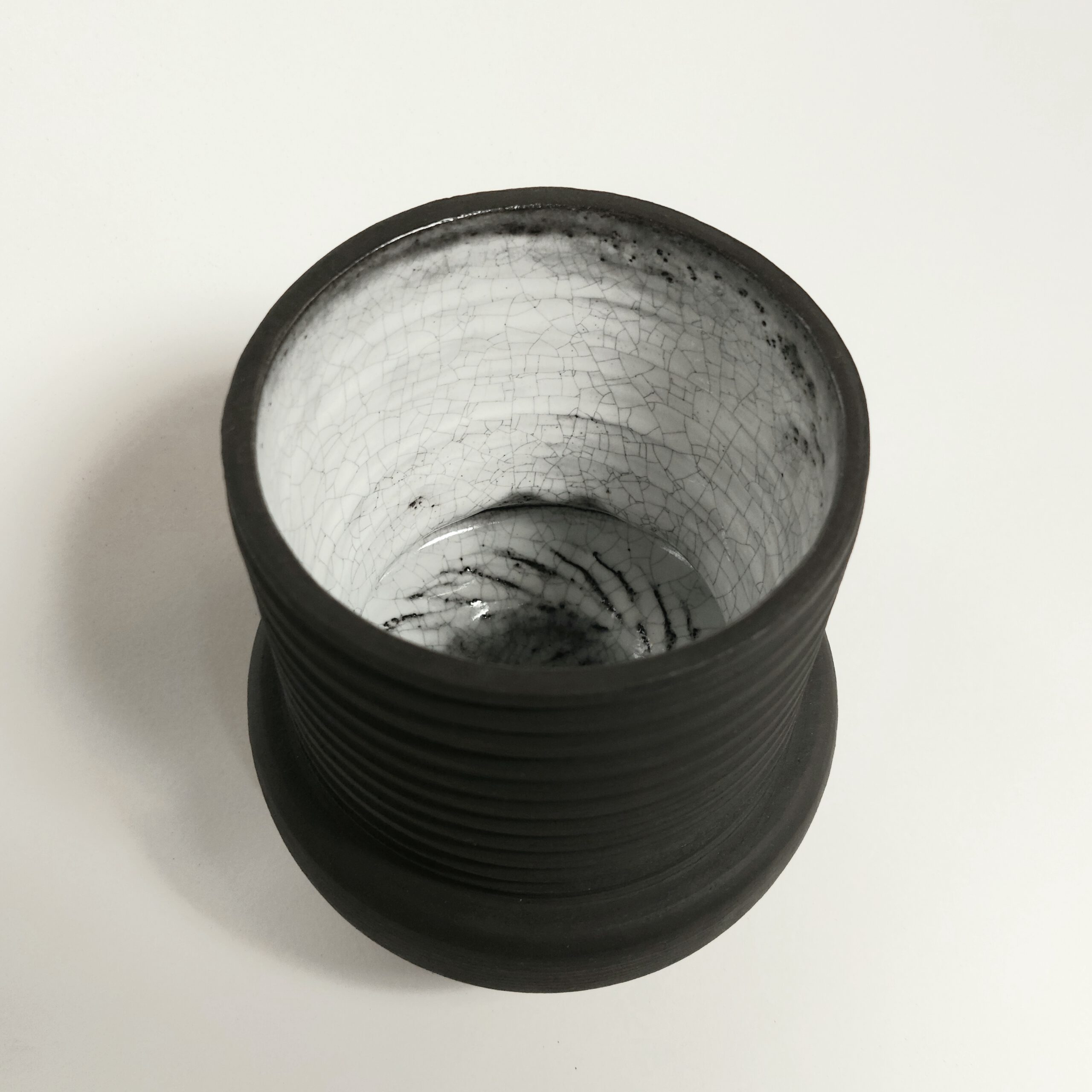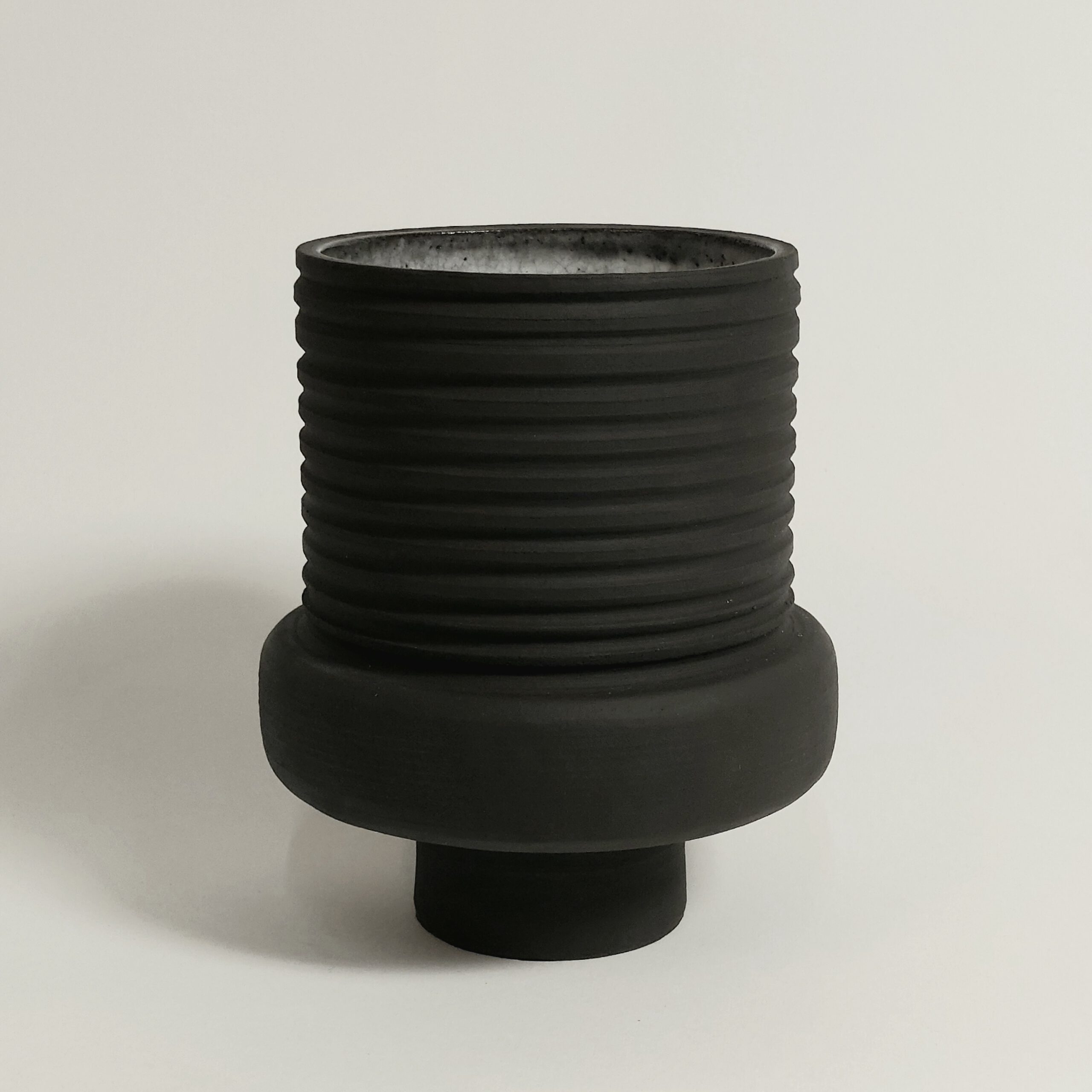 Footed double cylinder shaped vessel, deep grooves, thrown ceramic,