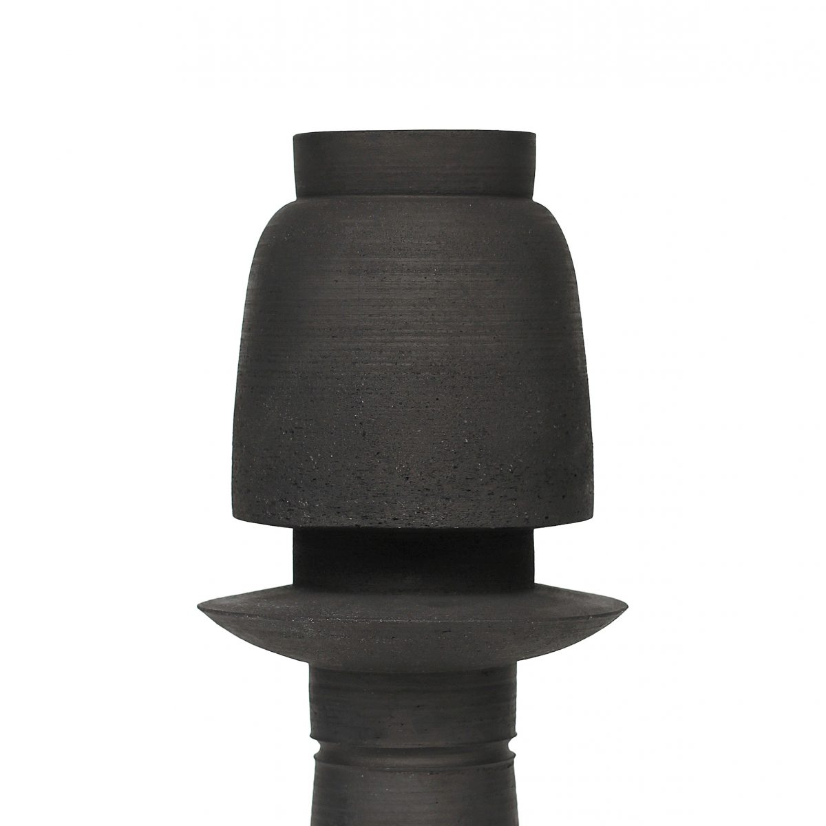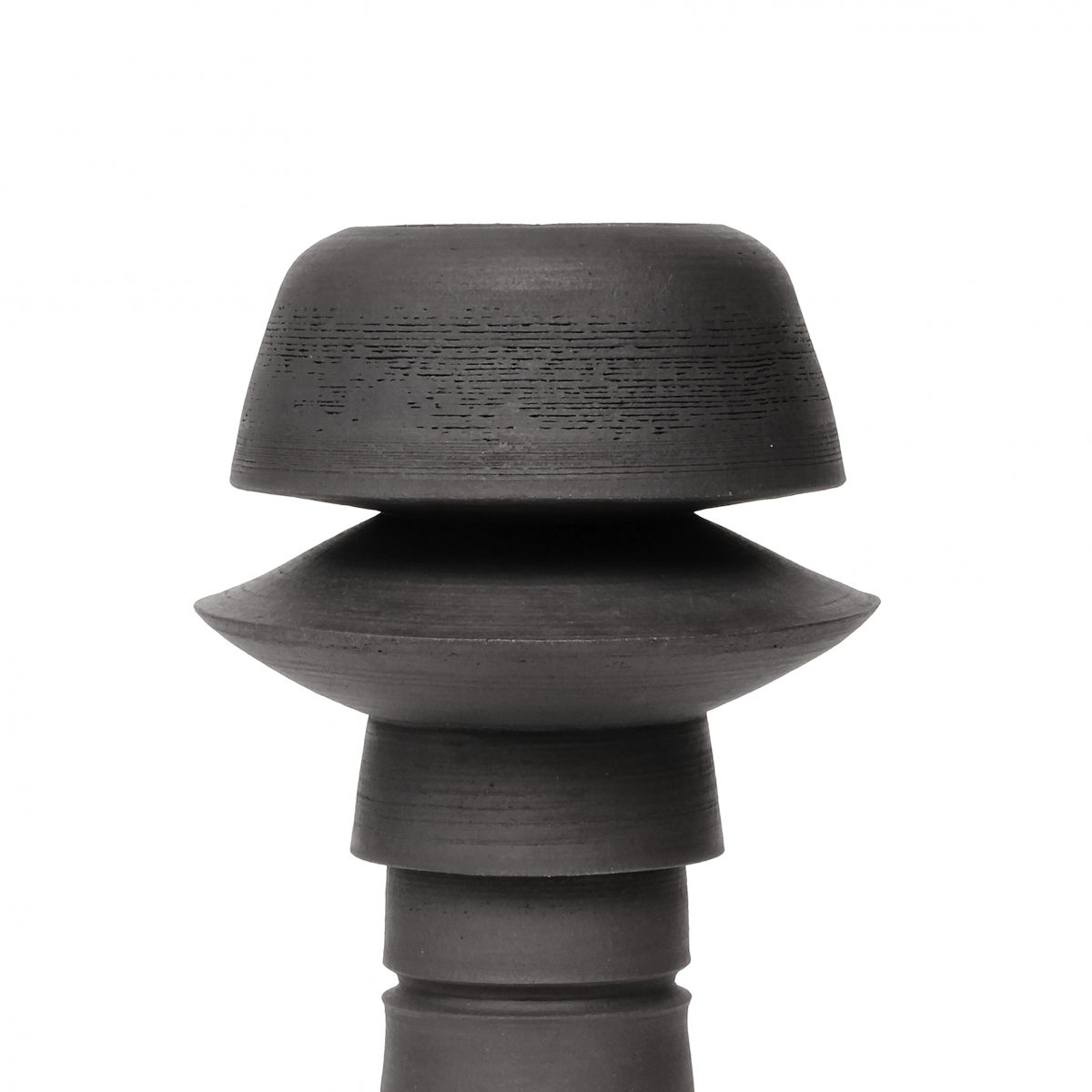 Sowohl die schwarzen und als auch die hellen Stücke werden außen nicht mehr glasiert. Die Farbpalette betont die Konturlinien. So ist in jeder Keramik der Entwurf, die Zeichnung, mit der alles anfängt, spürbar. Glasiert sind die Stücke trotzdem, meistens mit weißer Craquelée von innen. Die – verglichen mit der Tradition – umgekehrte Oberflächenbehandlung führt den Blick ins Innere: eingebaute Stützen und Etagen erzeugen fast schon Architekturcharakter. Aus Vase oder Gefäß wird ein skulpturales Objekt mit eigener Symbolik und offener Bedeutung.